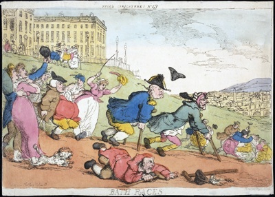 BATH RACES Nov 1810 Next → Bath Races Thomas Rowlandson 1810 Published by J Sidebotham, 2 Sackville St. Copper engr. Uncoloured Teggs caricatures No 49. Price one shilling coloured. Cripples Corner streetname.