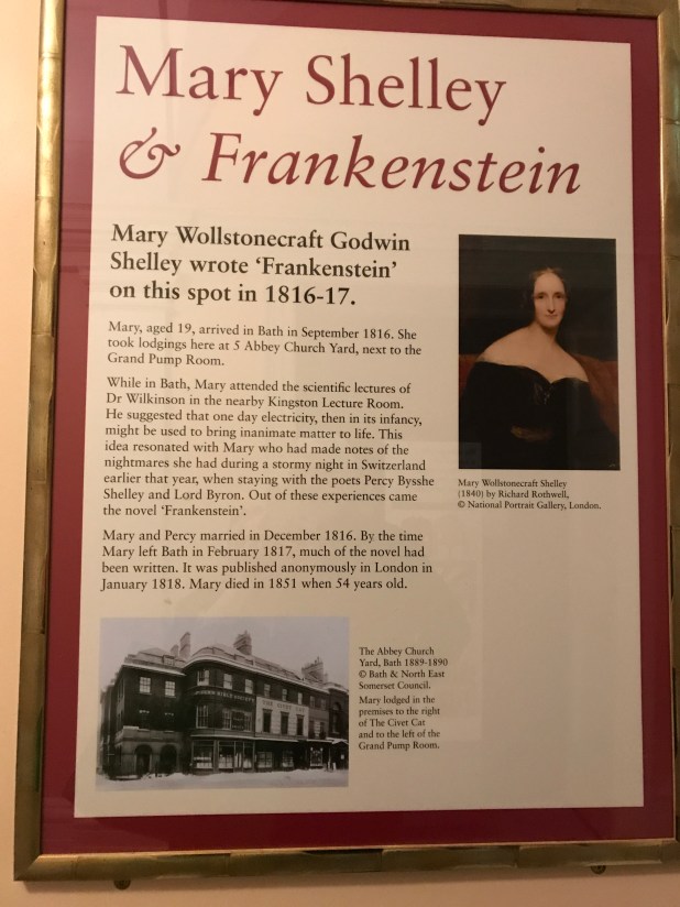 Mary and the poet percy Bysshe Shelley, who she married in 1816 after a long affair, lived in Bath between 1816 and 1817 (I do know this was because Percy was hiding from people he owed debts to in London, and Mary’s family had disowned her prior to thier marriage so her father and step-mother would not offer her protection). The information below, that is on display in The Pump Room in the City of Bath, explains how scientific lectures that she attended in Bath influenced the novel that she completed during the time she lived in the city. It was quite a strange time for the couple, because Percy’s wife was found drowned in the river Thames, pregnant by another man. It appeared to be suicide. It left him fighting a legal battle to be able to see his children too, which is potentially one of the reasons he hastily married Mary. He was not a monogomous man in any context, and was potentially having an affair at the time, but living in sin was turning the odds against him and making the chances of him winning the custody of his children unlikely.