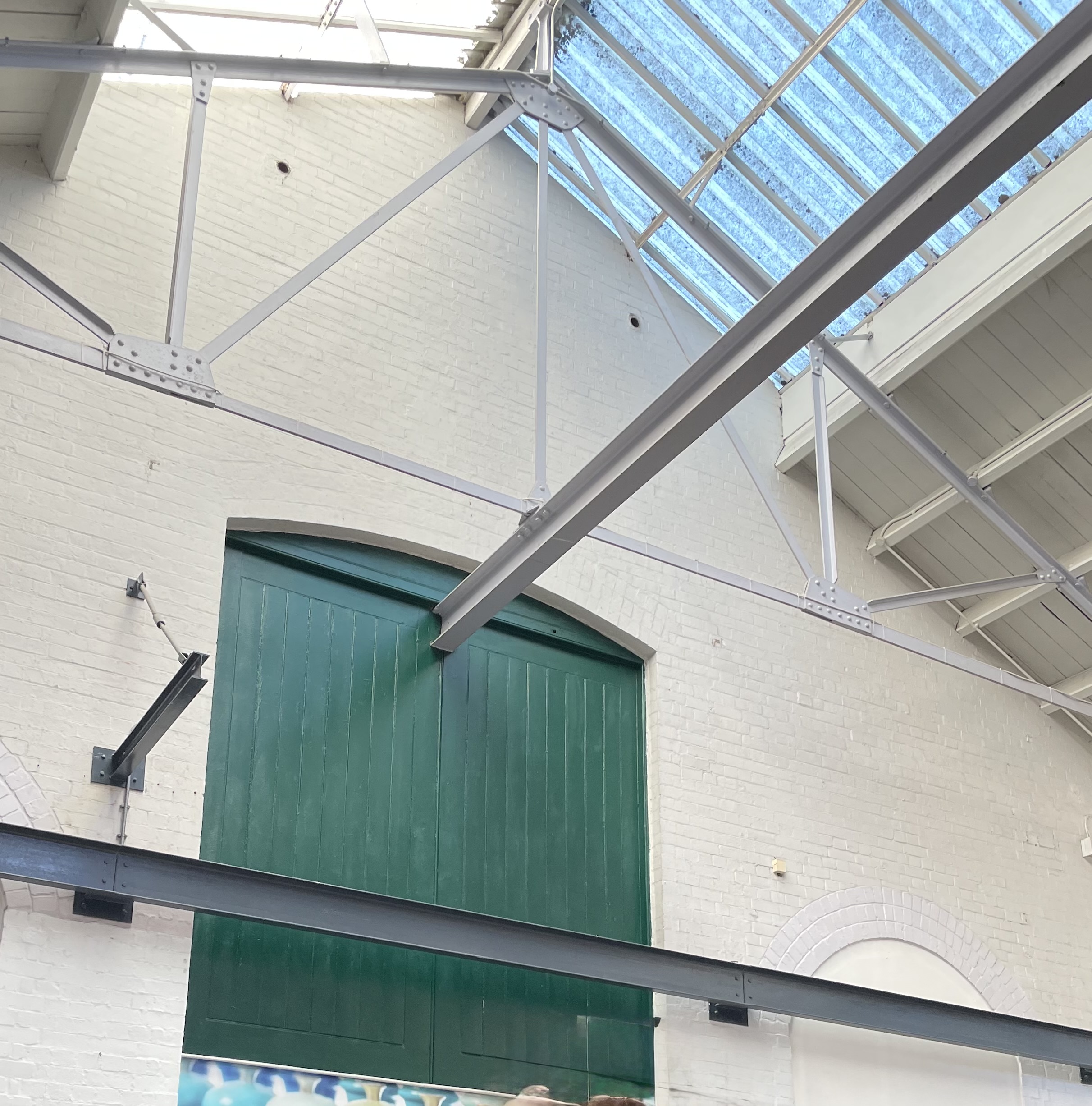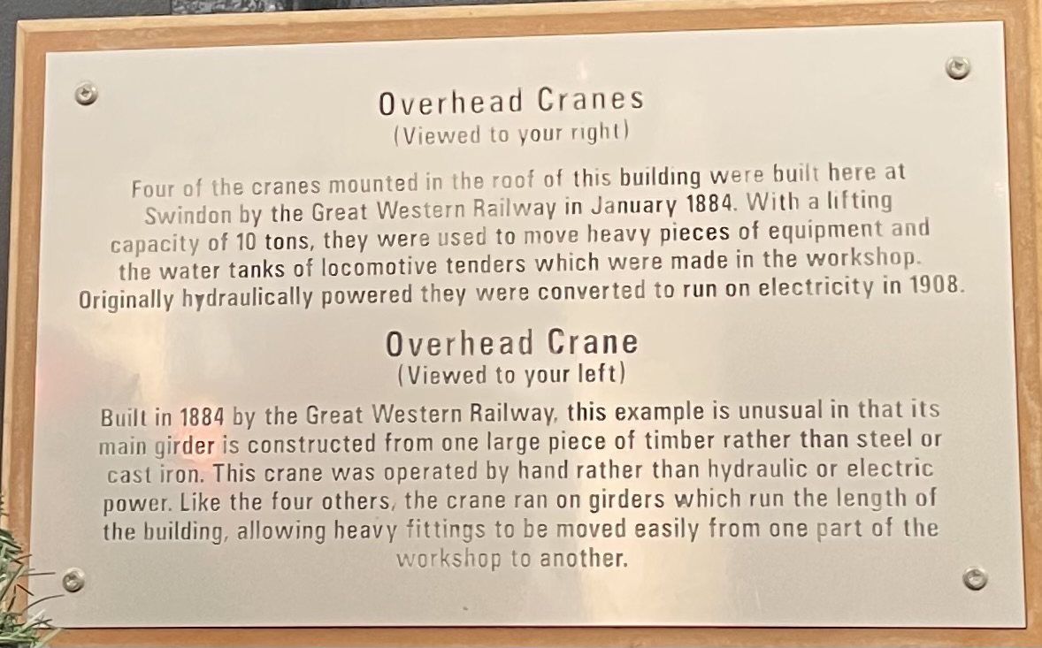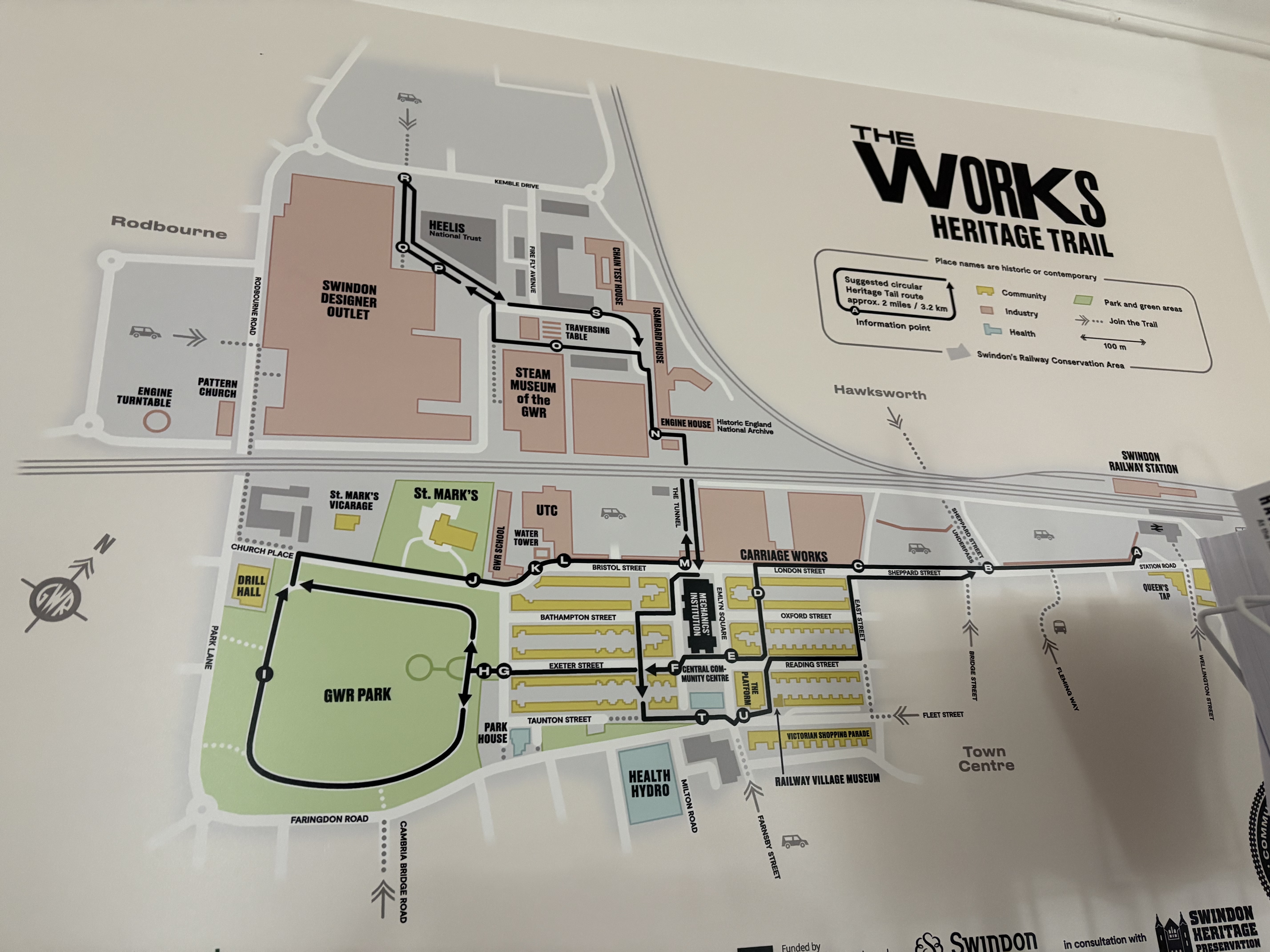 The third place I will tell you about is Swindon’s Mcarthur Glen Designer Outlet. This shopping centre has been built in a large expanse of the old Great Western Railway workshops. This is another space I have walked around often in the years since it was built. I knew it was the old railway works. It has an obvious flavour of the old railway works because it still has industrial items on display and the workshop structures are left, as much as they can be, as they were. However, three years ago I joined a tour of the outlet village led by Gordon Shaw who used to work in the factory and had since spent time researching the history of the working environment and the way of life within it. This tour opened my eyes to things I had not noticed before, so, if you go to the outlet village in Swindon, look up and look around and you’ll be surprised what you see.