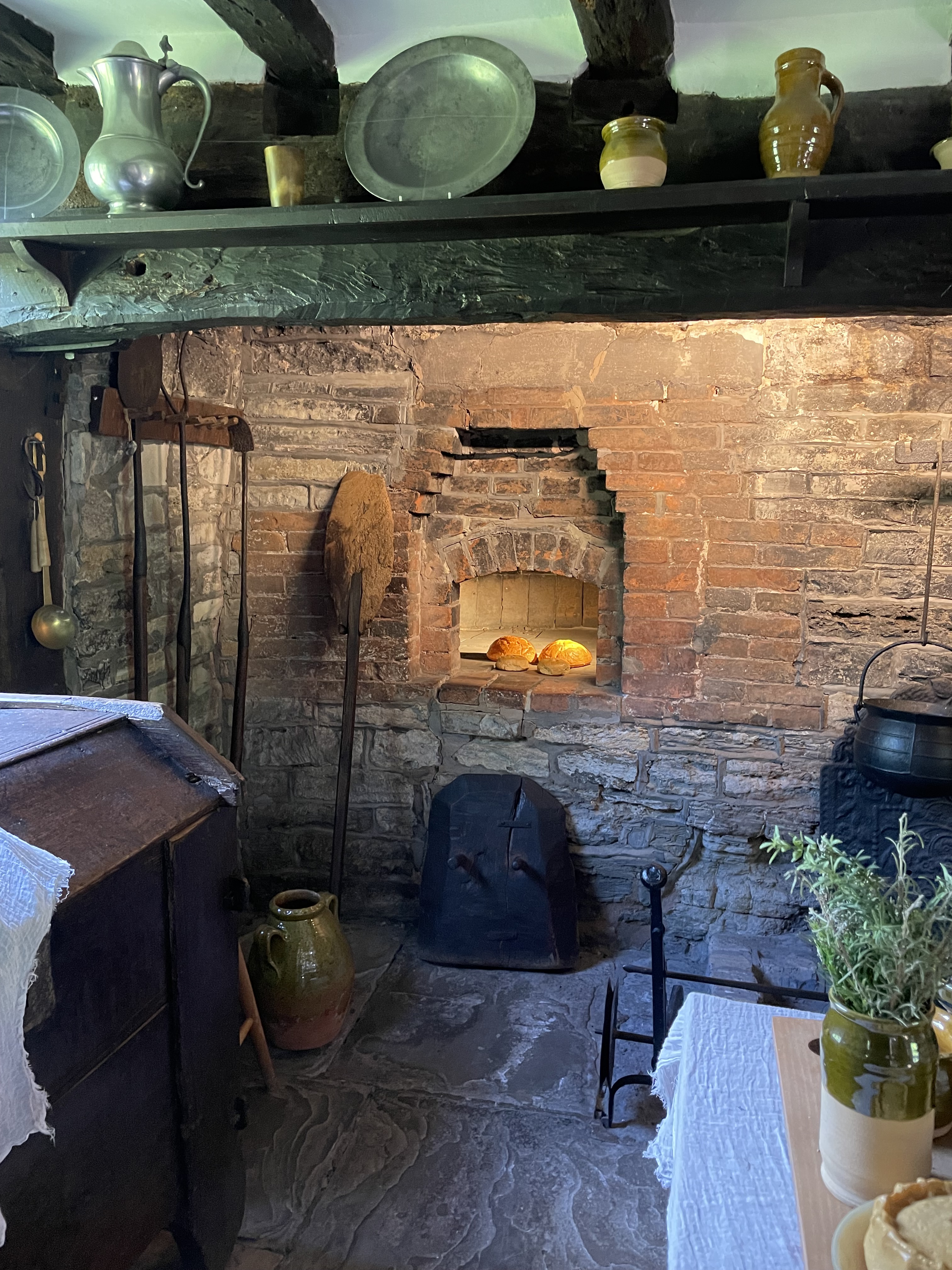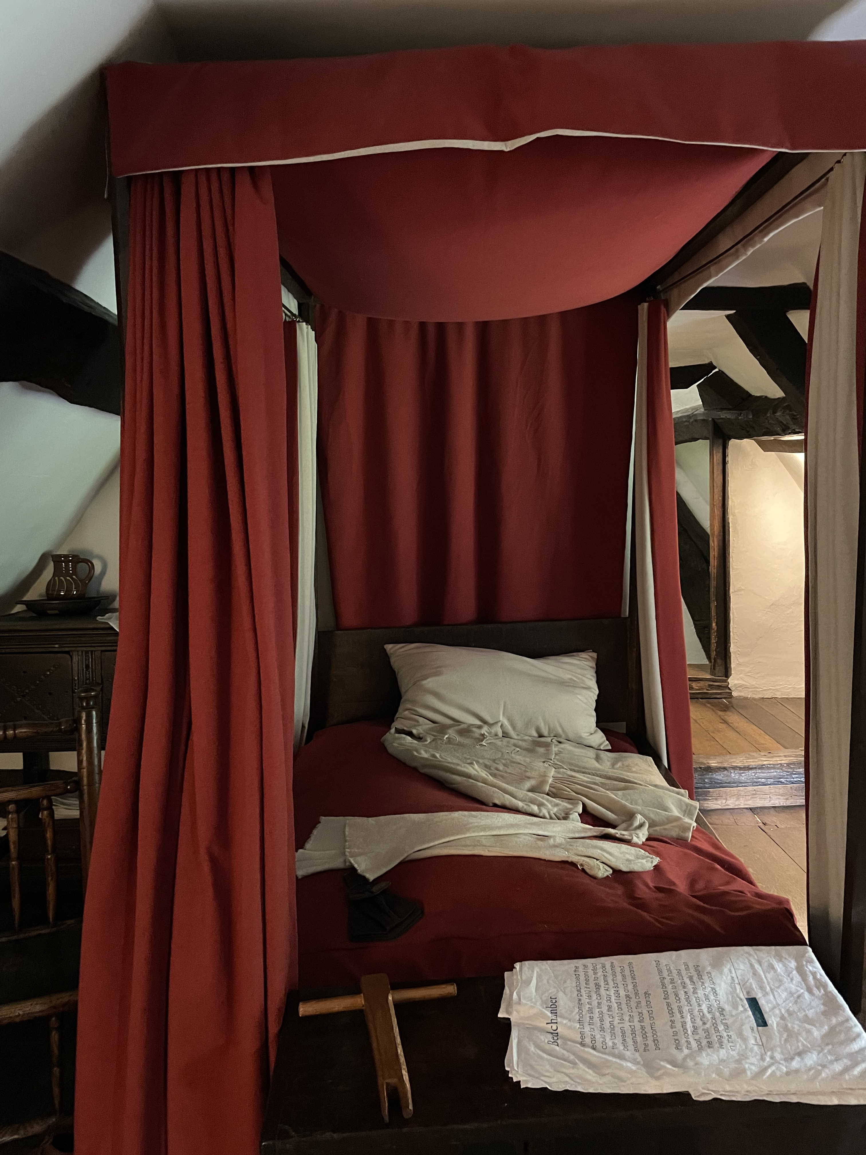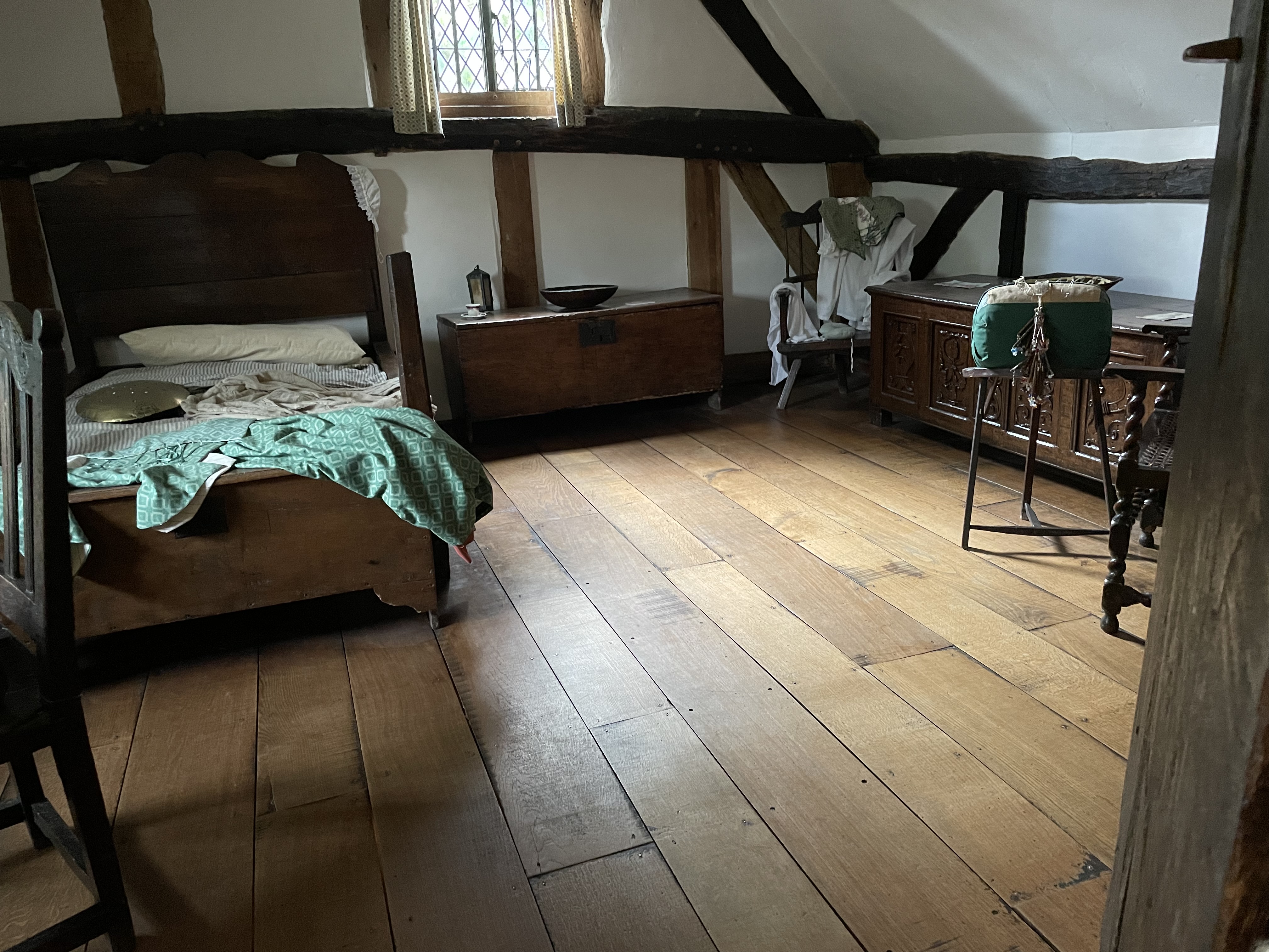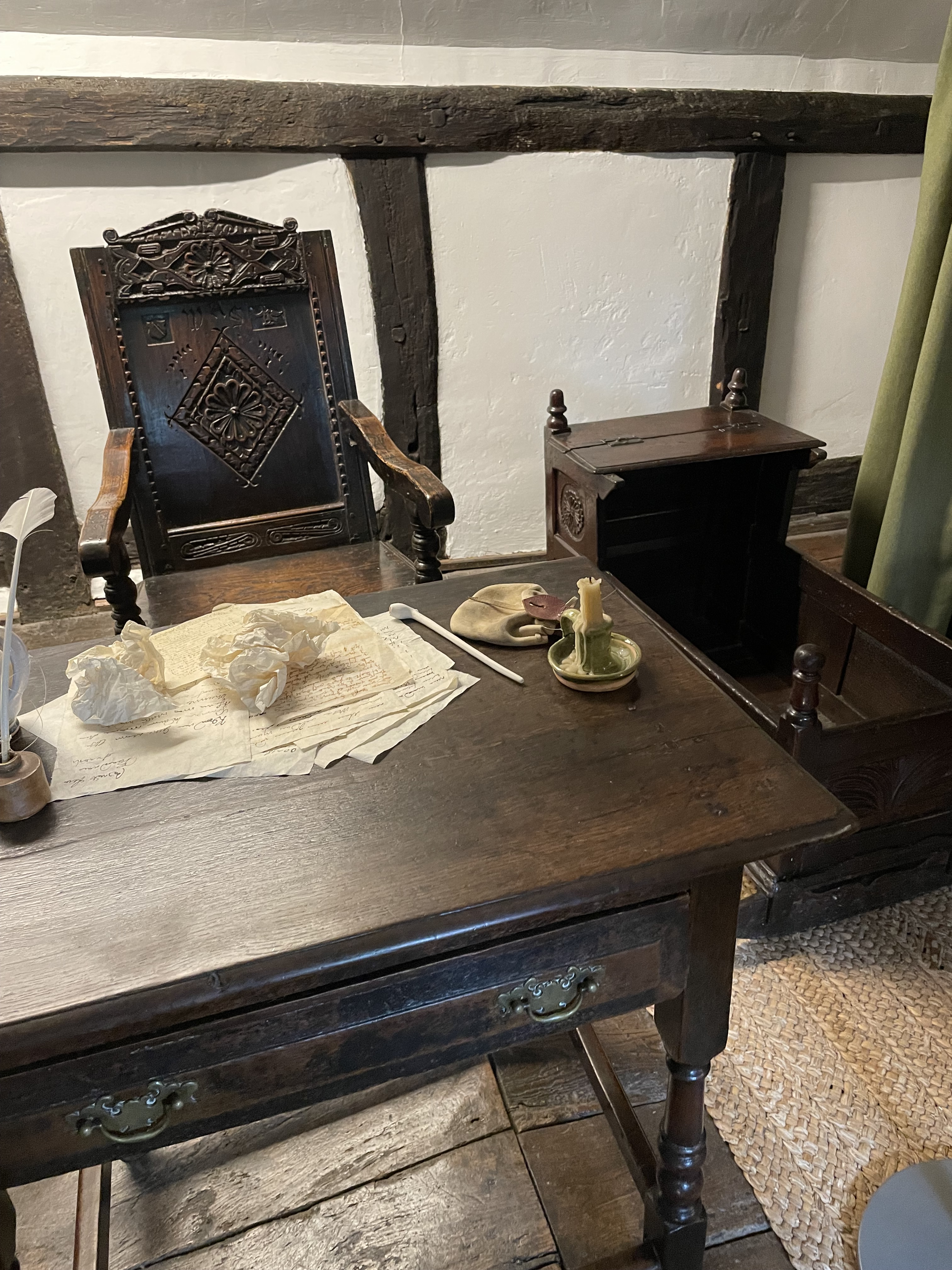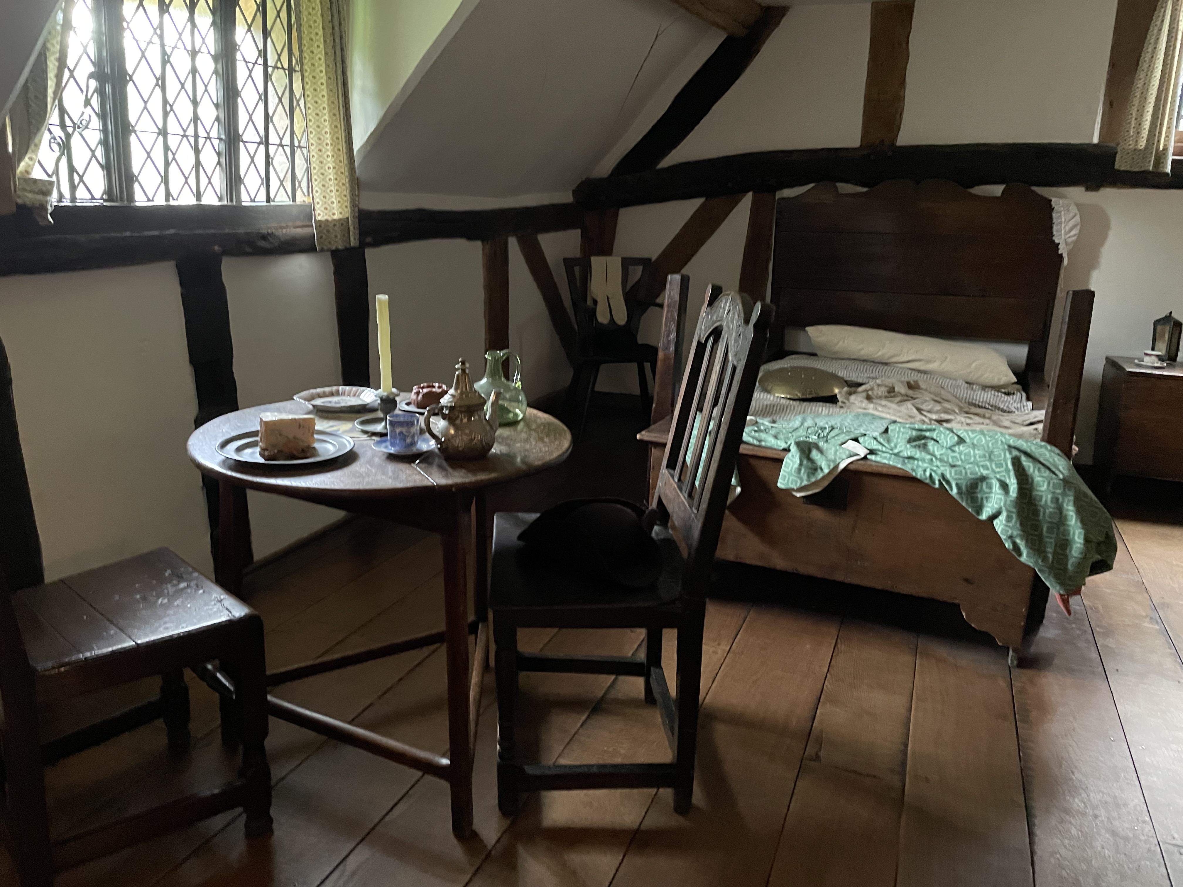 The cottage, Anne’s family home, where she was born and raised until she left when she married William, is preserved in the state it first became a tourist destination in the 18th Century. This home for sheep farmers was originally called Hewlands Farm. Its first phase was built in the 1400s, a simple long hall like dwelling that was leased to farmers by the land owner (very much like the house I live in). Unlike the guildhall in the town, this humble dwelling did not survive with many of its original features. As someone’s home it would have been updated with new fashions, and was extended as ways of living changed over the centuries. However in the 1700s they were far from modern ways of living, which means many very old structures and furniture has survived in situ.