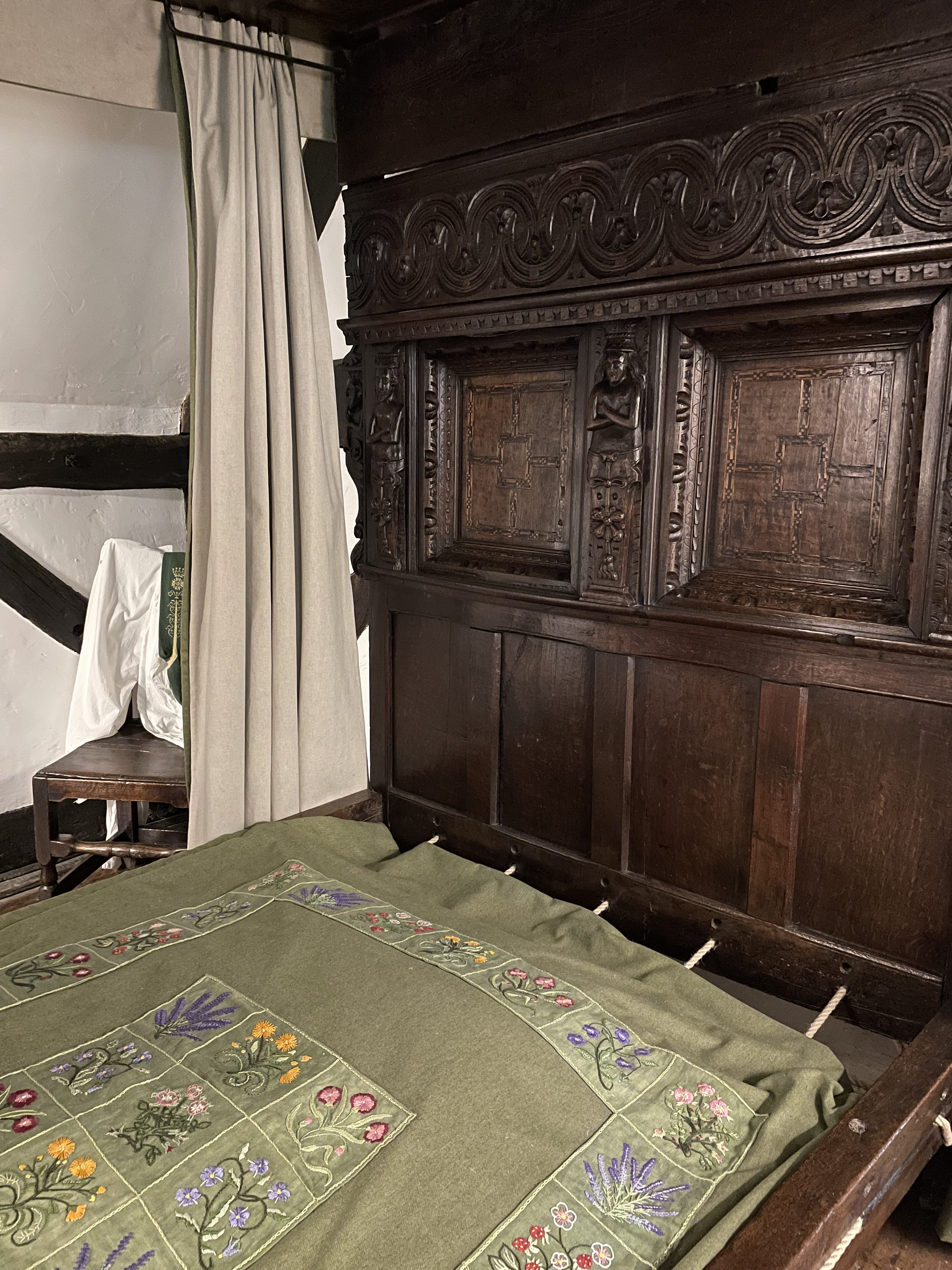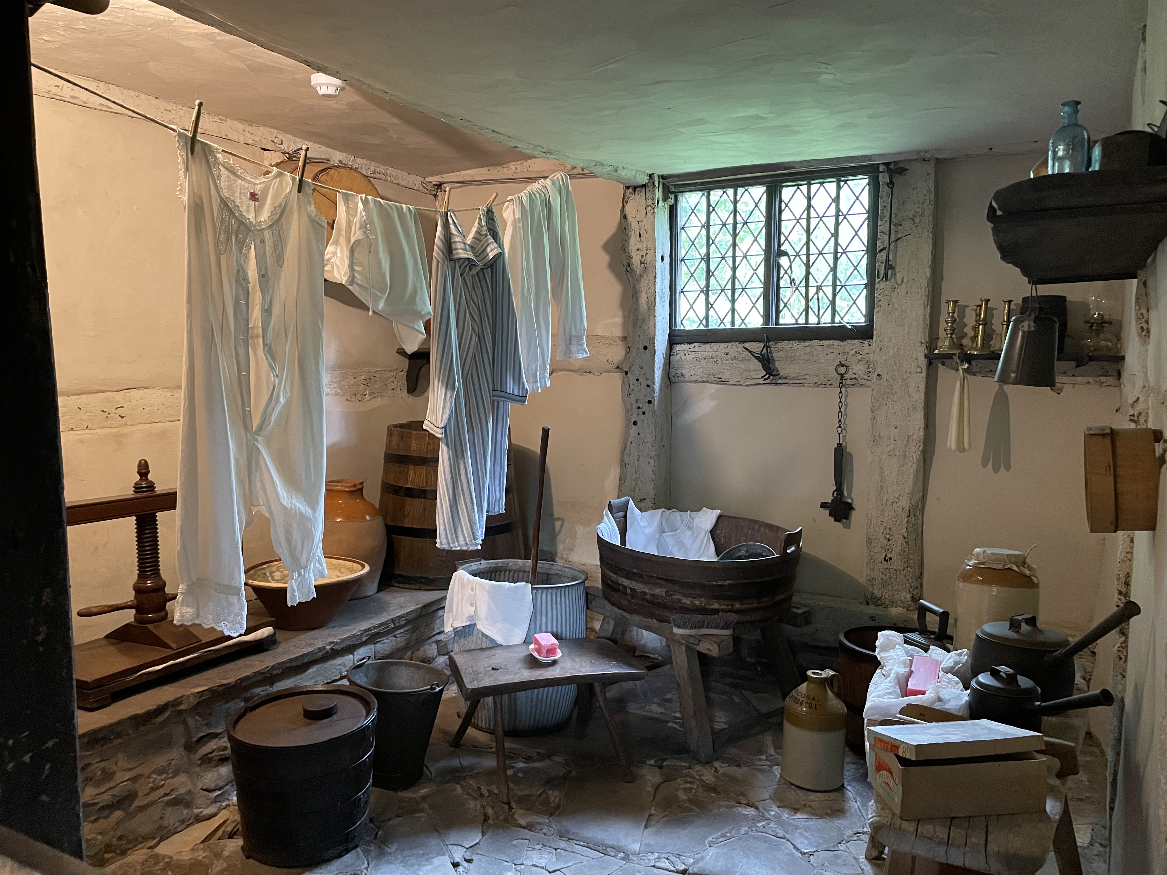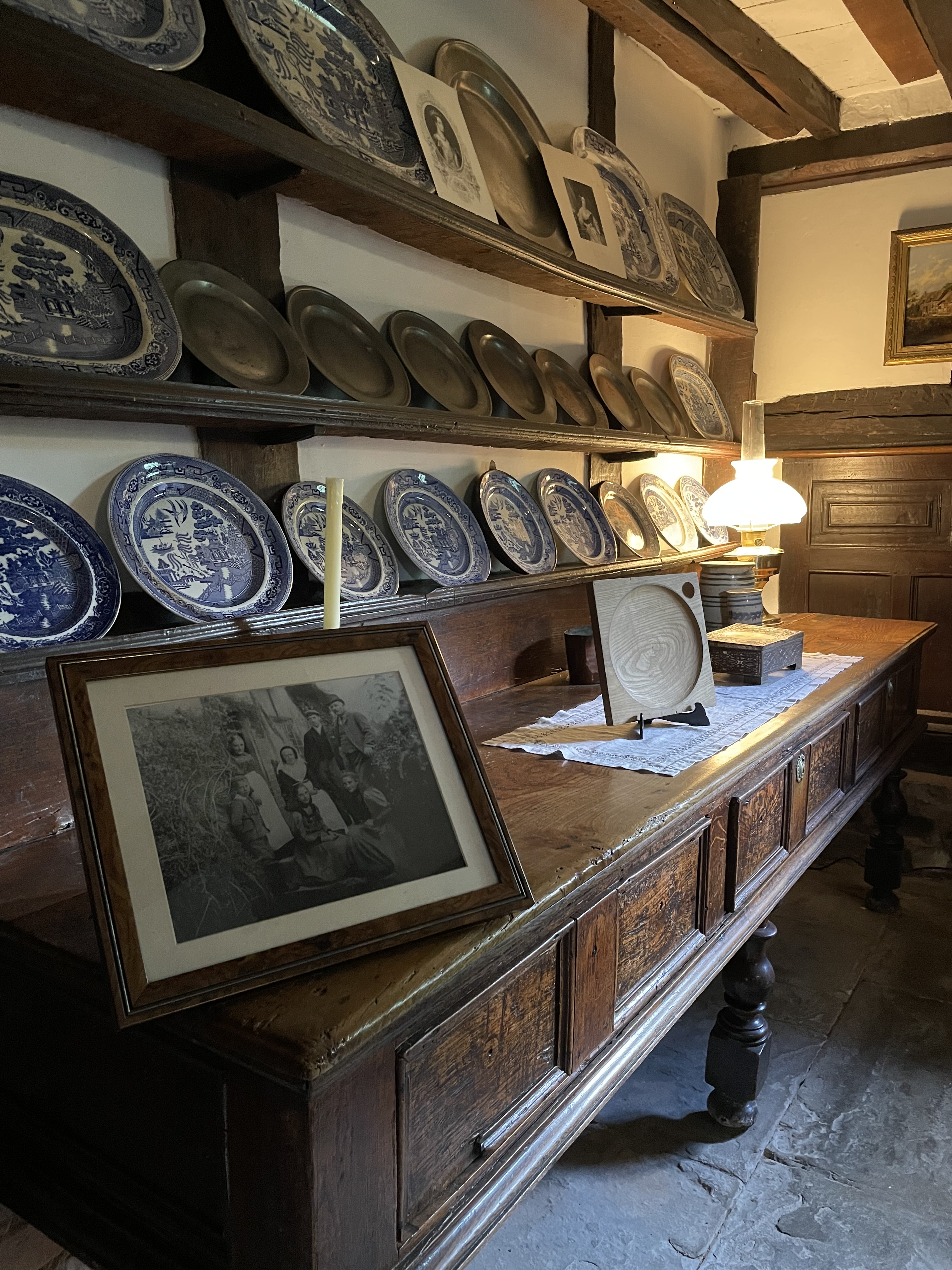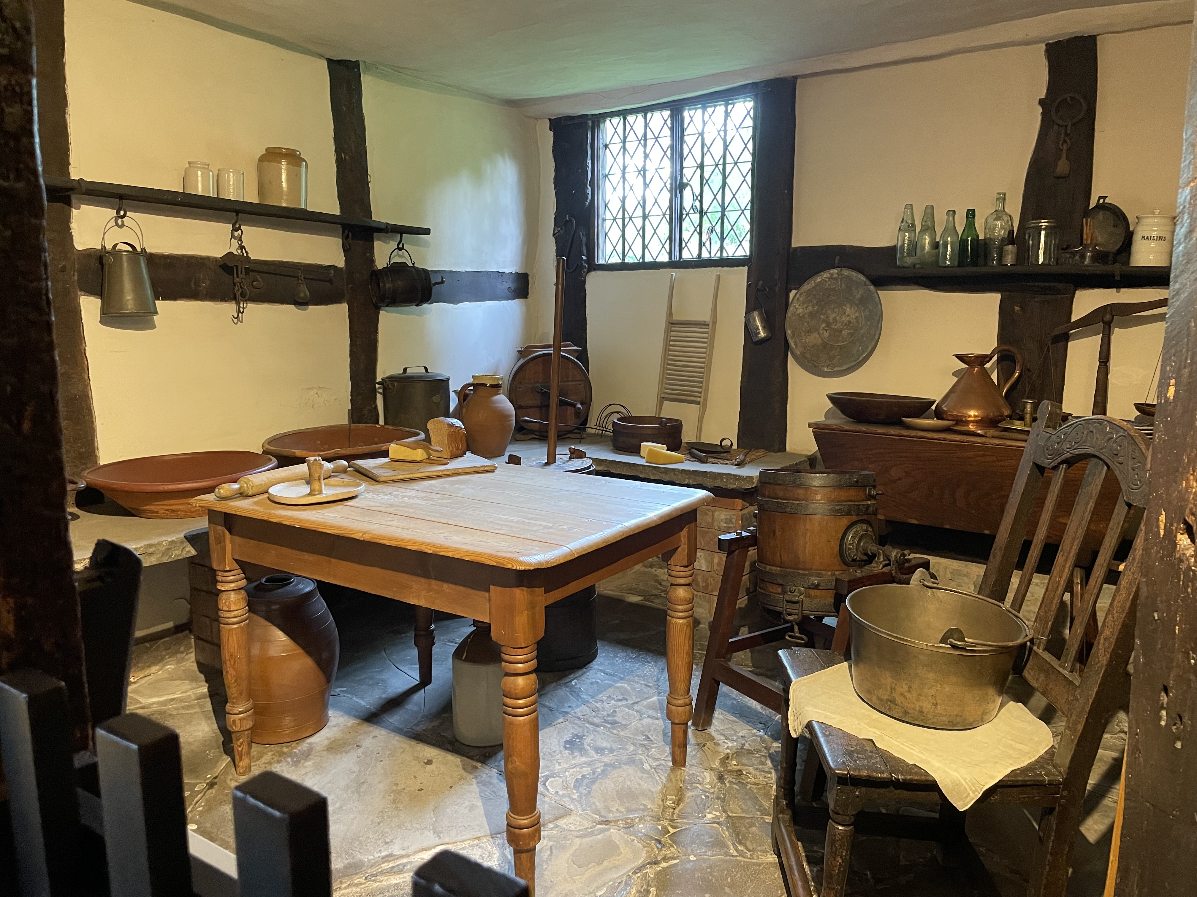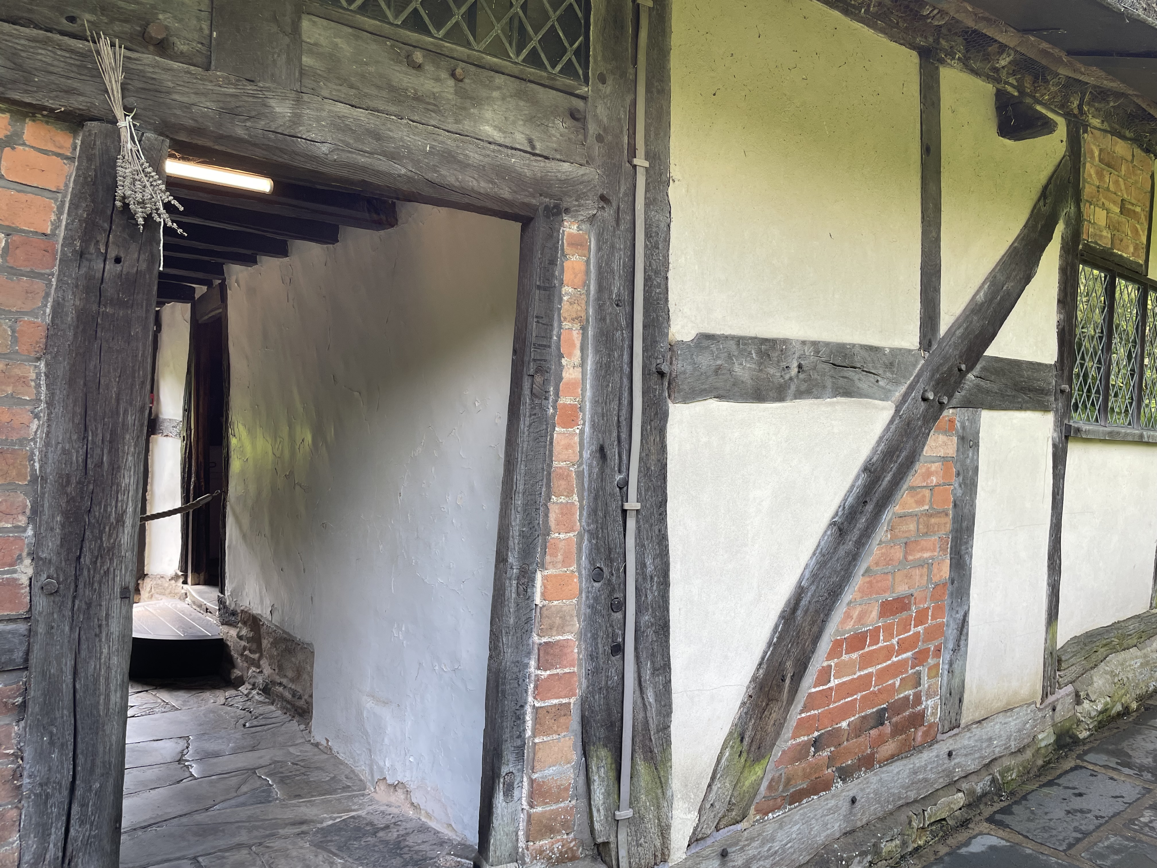 The cottage, Anne’s family home, where she was born and raised until she left when she married William, is preserved in the state it first became a tourist destination in the 18th Century. This home for sheep farmers was originally called Hewlands Farm. Its first phase was built in the 1400s, a simple long hall like dwelling that was leased to farmers by the land owner (very much like the house I live in). Unlike the guildhall in the town, this humble dwelling did not survive with many of its original features. As someone’s home it would have been updated with new fashions, and was extended as ways of living changed over the centuries. However in the 1700s they were far from modern ways of living, which means many very old structures and furniture has survived in situ.