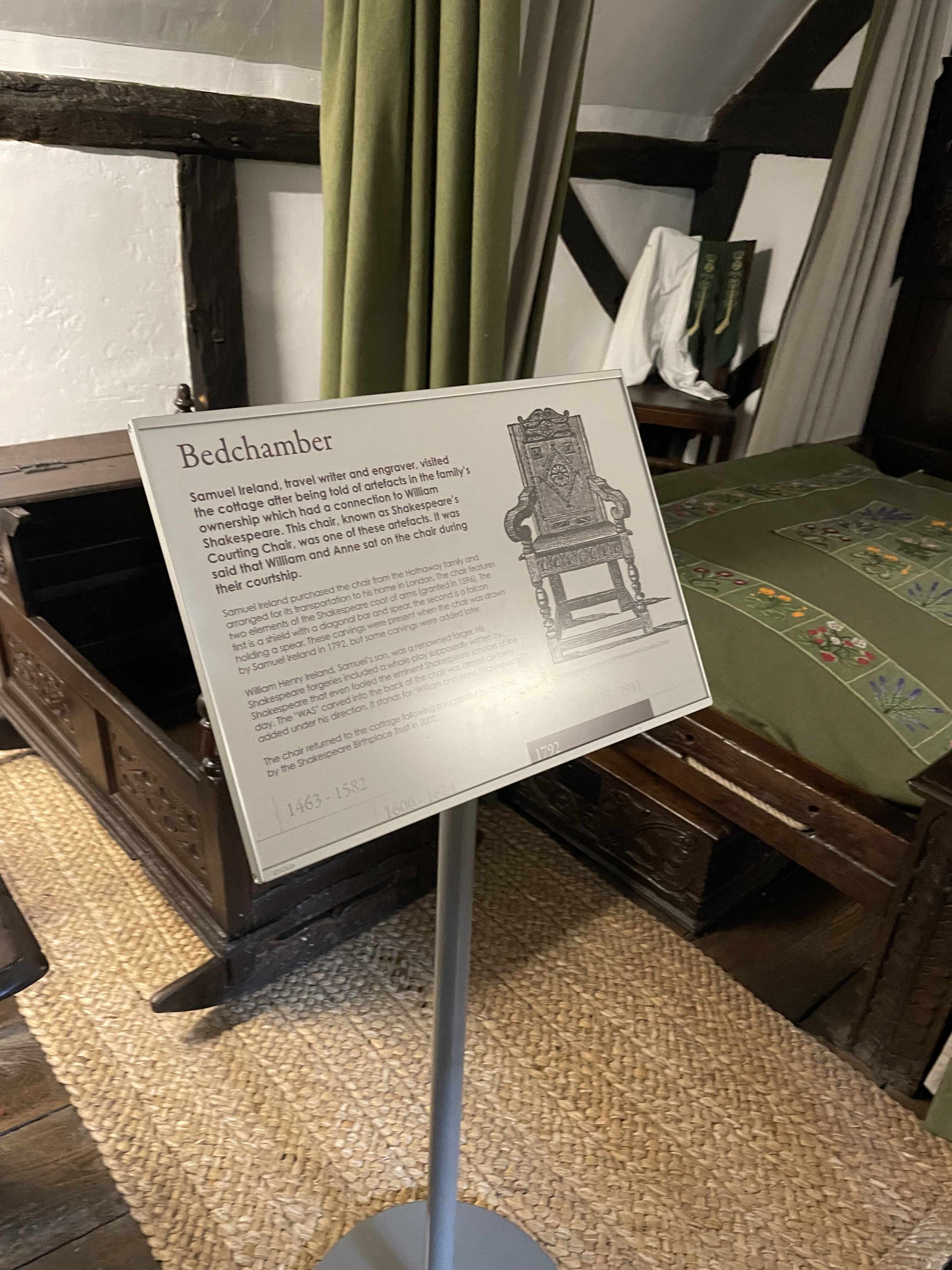 Her best story/hustle that I discovered, though, were the pieces of wood she allowed her visitors to chisel off an old oak two seater settle where she claimed William Shakespeare sat beside Anne during they’re courtship. The current managers of the property, The Shakespeare Trust, know that the settle is no where near that old. It was complete nonsense and Mary Baker knew it.