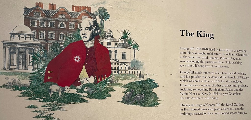 King George III was well known for his interest and knowledge in botany, he was nicknamed ‘the farmer’ because of his involvement in the practical management of his royal land estates. It’s commonly known he returned to Kew when he became mentally ill because Kew palace and its gardens were a comfort to him. He loved Kew, and from this perspective, of an Eden created especially for him by his mother, I can understand why.