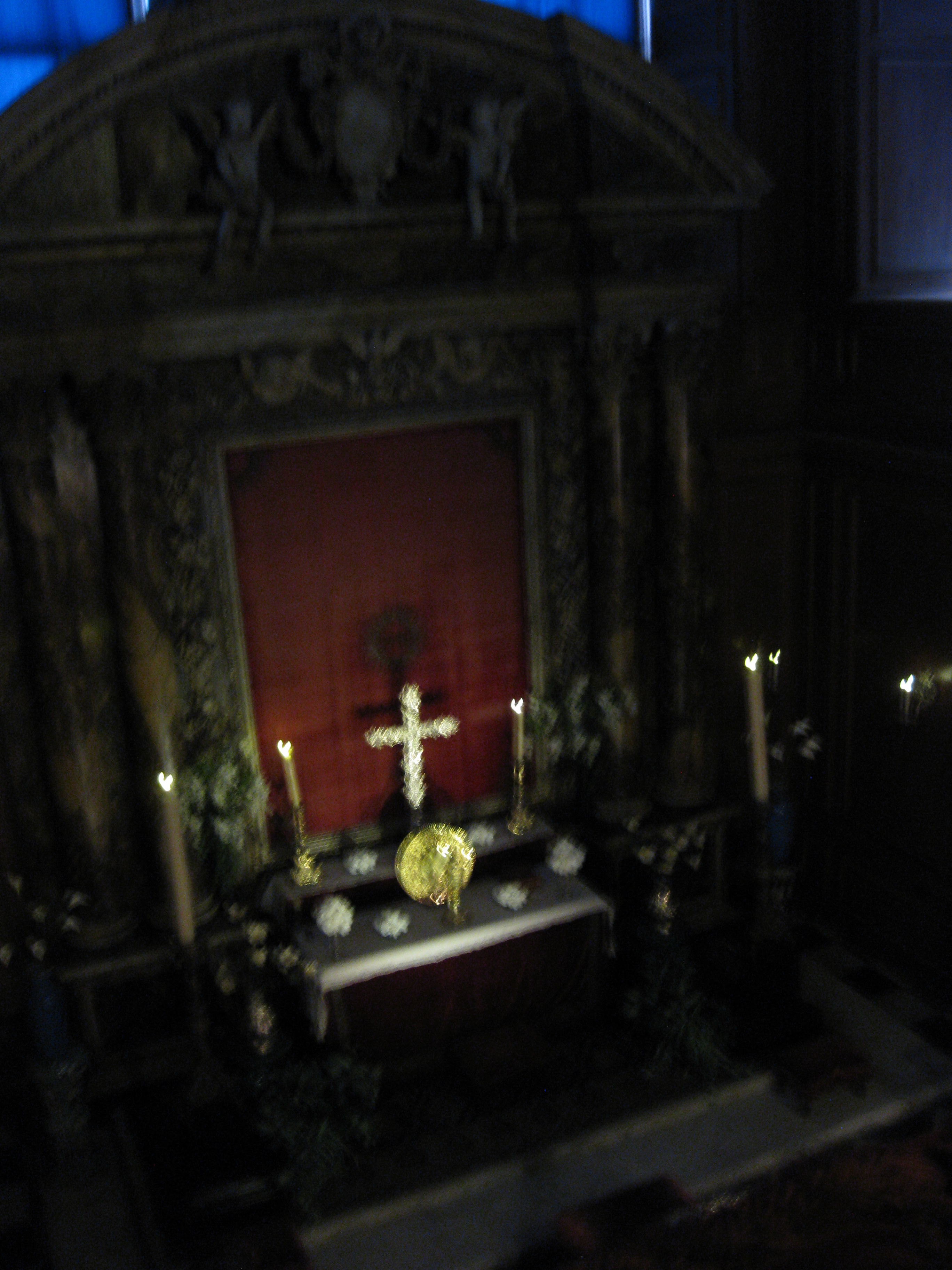 The first picture below is that of the side aisle showing smaller box pews, although the smallest are a single pews width and length. The second is of a larger box pew before the altar. This was probably occupied by upstairs servants or perhaps a wealthy tenant farmer’s family. The third picture is of the outside entrance of the St John’s family pew. In the fourth picture I have included the St John Triptych just one of the monuments the family left in the Church. On the fourth you can see another monument which is at the back of the St John family pew, the family pew runs the length of the right hand side of the picture. This pew cannot be seen into, but the family can easily see the pulpit and the vicar can see them. On all the pictures you can see elements of the medieval paintings but the last picture I have included, which also shows the beautiful screen, shows my favourite painting of the cross and if you look closely you can see the apostles looking up at it, as well as a script on the left hand wall.