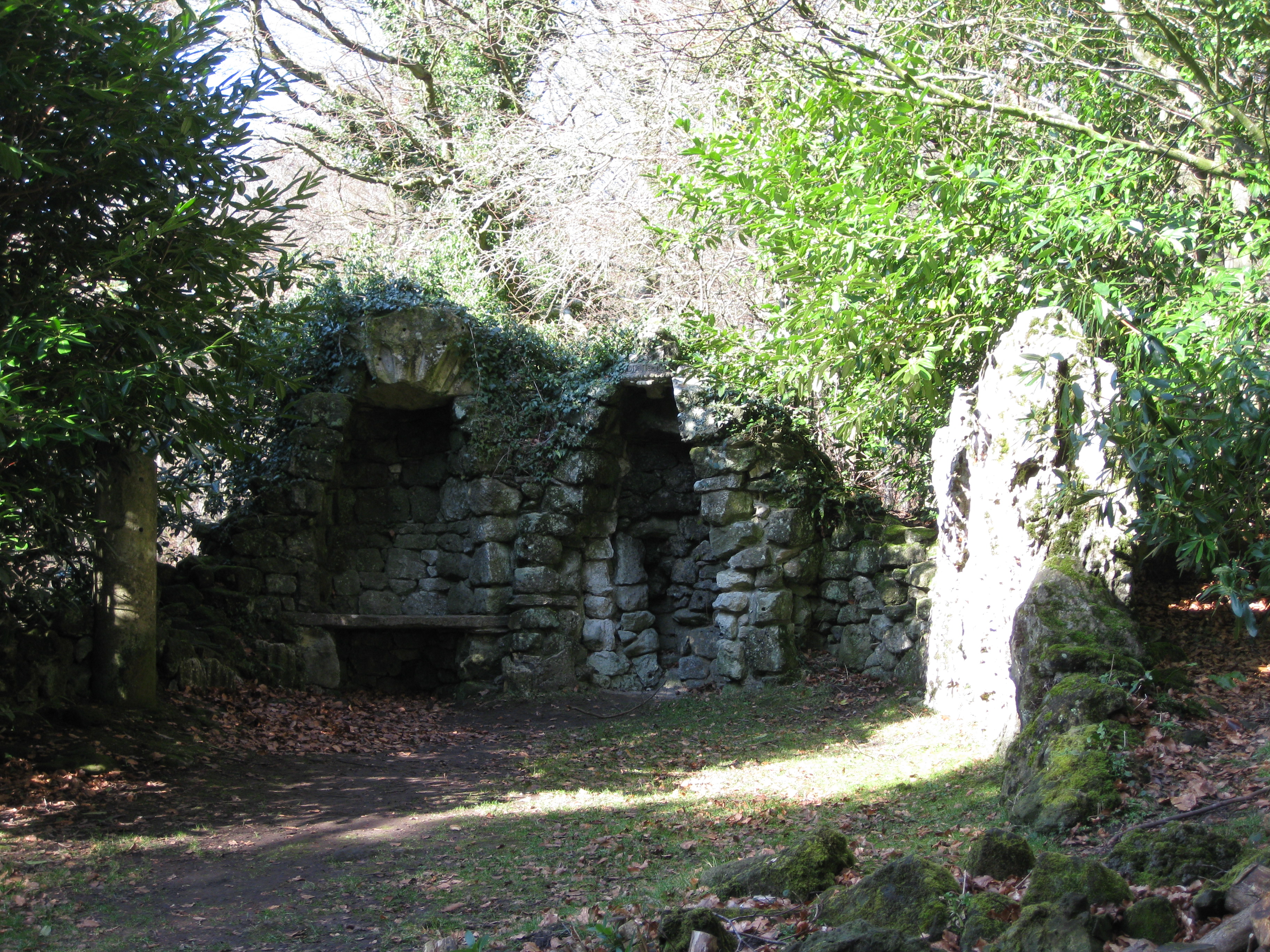 To add entertainment to the developing pleasure garden of course it had to have a Grotto, which was placed facing the ruins on the far side from the Banqueting House, on top of the old terrace which was still lined by a yew avenue. It was built in 1792 by Josiah Lane of near by Tisbury, a well known local builder of garden ornaments. And you can see like Pope’s Grotto, and that at Prior Park, it is eclectic, containing ammonites and stalagmites. It has twisting, turning tunnels, and numerous little niches in which the explorer might perch and a frightening aura about it, to inspire the fashionable gothic imagination.