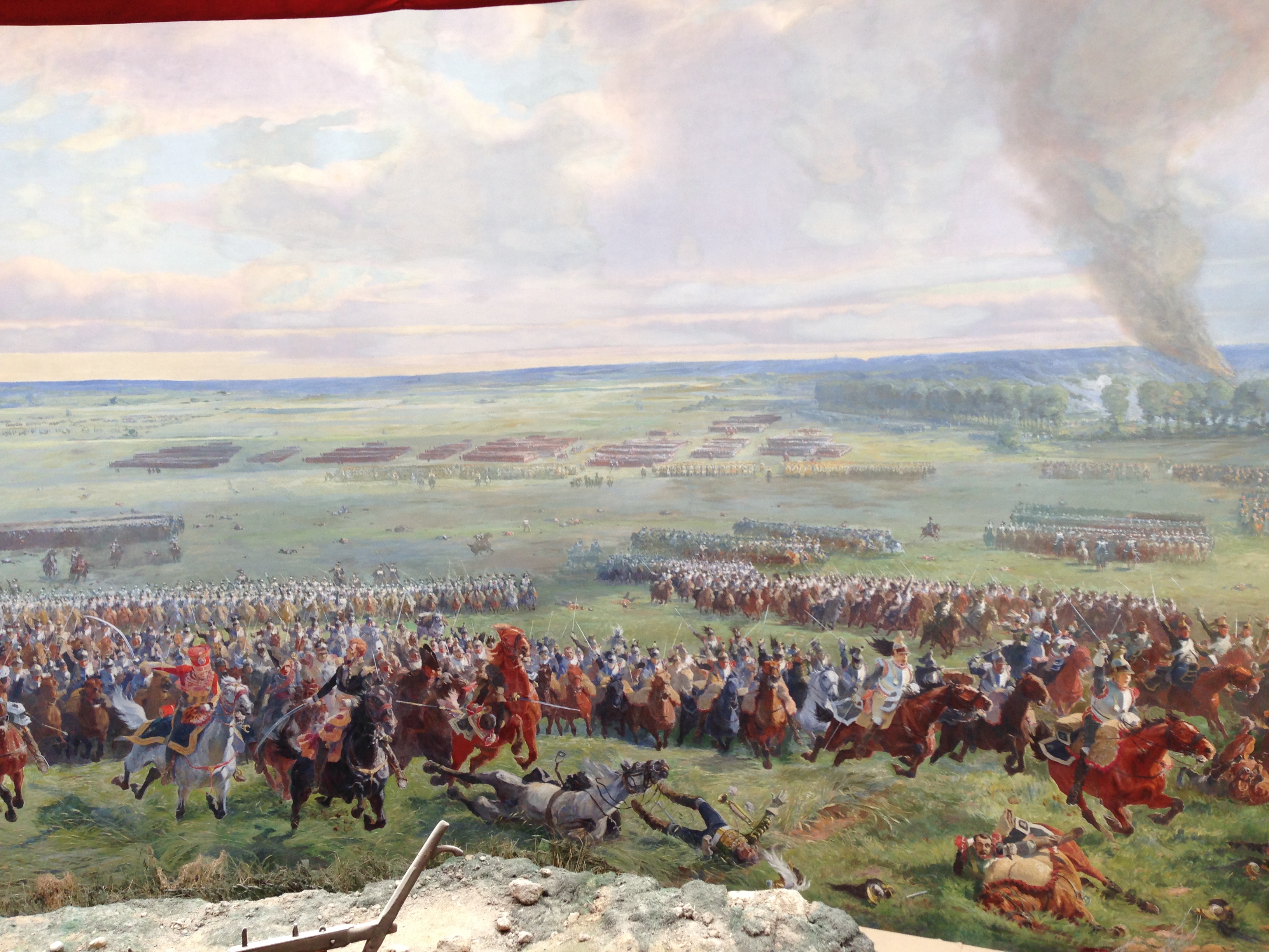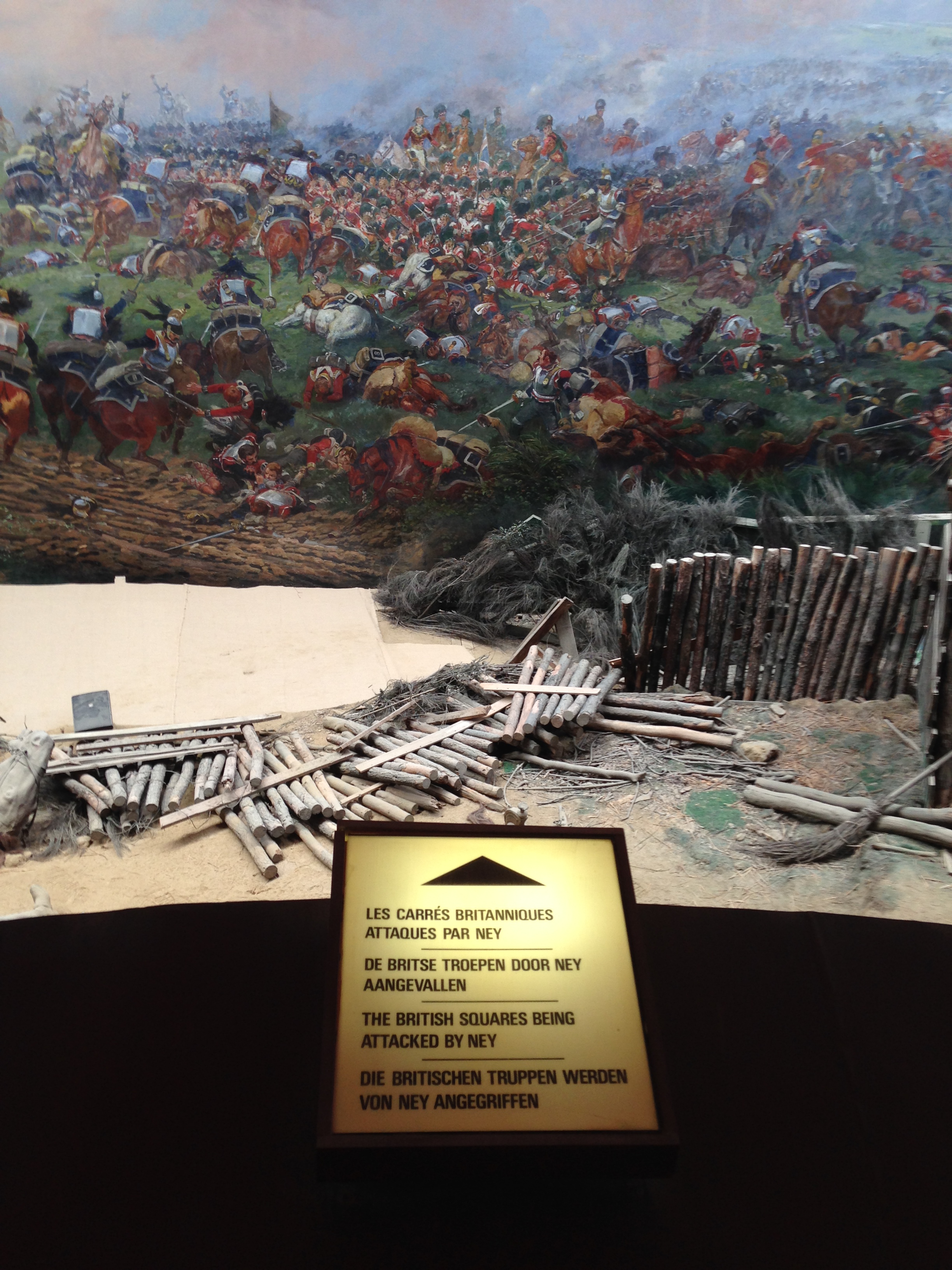 Inside the circular building is what the museum calls a panorama, a 360 degree painting, which you stand in the middle of, so that you get a greater sense of the battle, as around you the noise of battle, which I am sure does not replicate even one thousandth of the noise which must have gone on at Waterloo, makes you feel like you are there too – as models below the painting represent the bodies of men and horses who have fallen on the battleground and in the sunken road.
